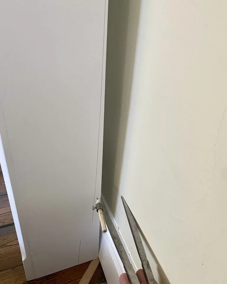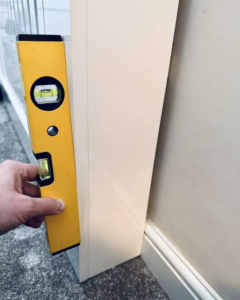 Push the cabinet back so it buts up against the skirting board. This creates a gap between the back of the cabinet and the wall. Plant a spirit level on the face of the cabinet to make sure the cabinet is plumb.