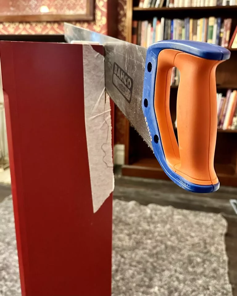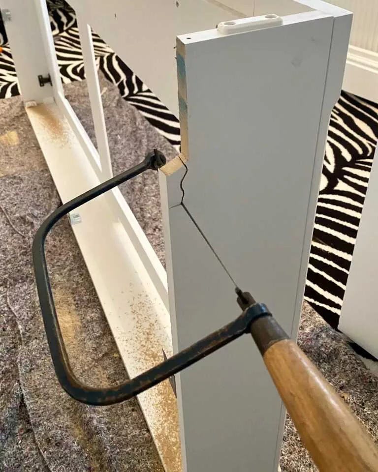 Turn the cabinet over now you have clearly marked the cut. Make sure you have floor protection down and there’s nothing on the floor that could damage the radiator cover or paint finish. Cut the straight part of the cut with a sharp hand saw.
