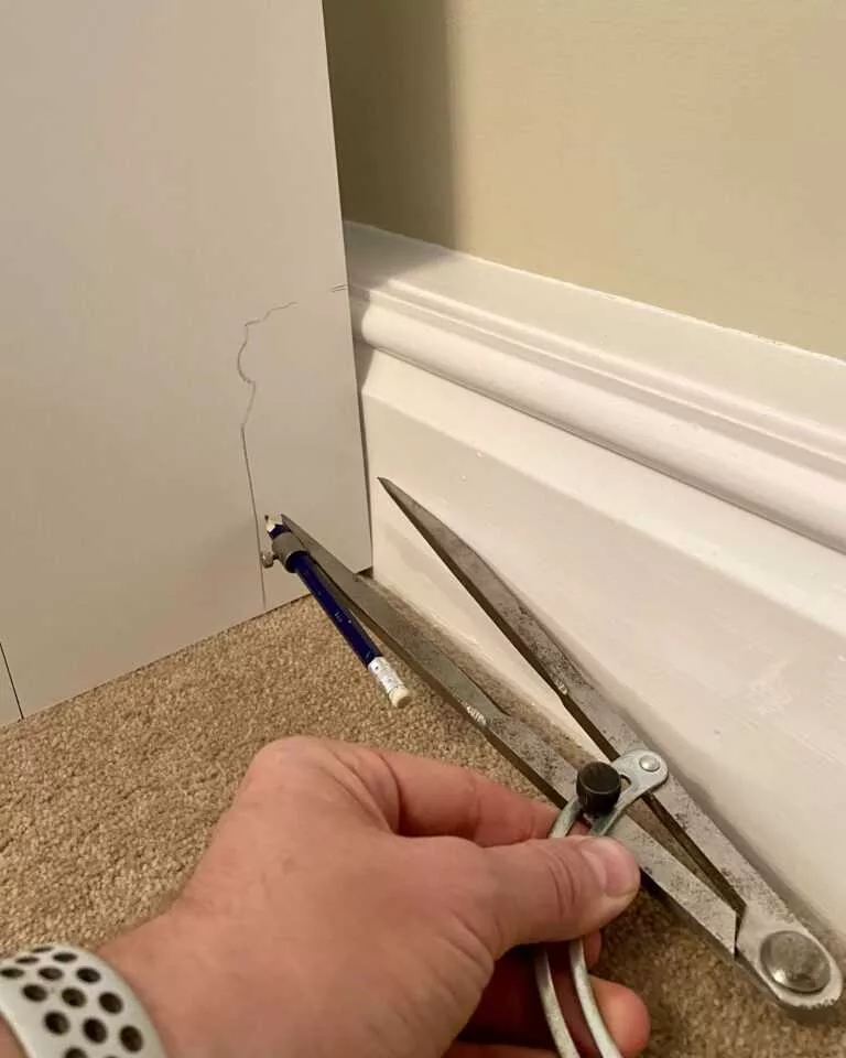 Take a compass or EasyScribe and open it to the widest part of the gap. Hold the cabinet still and mark the profile of the skirting board and any contours of the wall.
