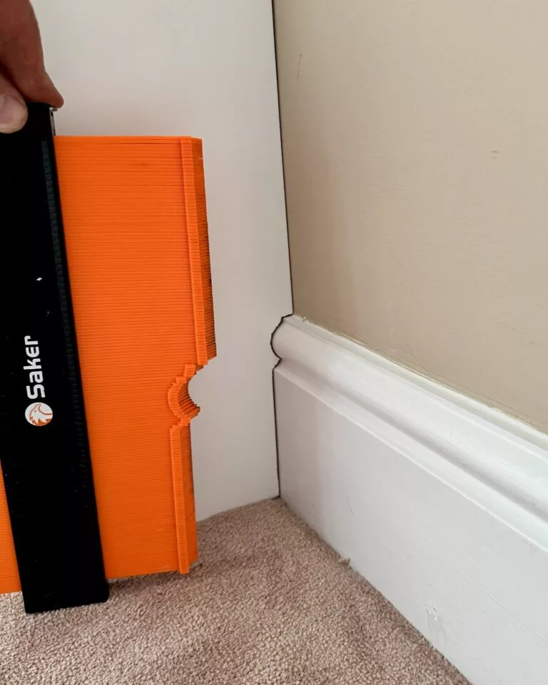 Offer the profile gauge upto the wall and press the pins into the shape of the skirting board to recreate the profile of the skirting board. Mark the shape you have created onto the side of the cabinet.