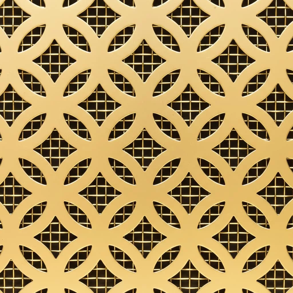 Shown here in our Polished Brass material, Cut from a solid brass sheet and mirror-polished to a warm, reflective gold finish. A true statement piece. These decorative grilles are standalone inserts designed for versatile DIY use, including custom cabinetry, wall vents, and furniture upgrades.