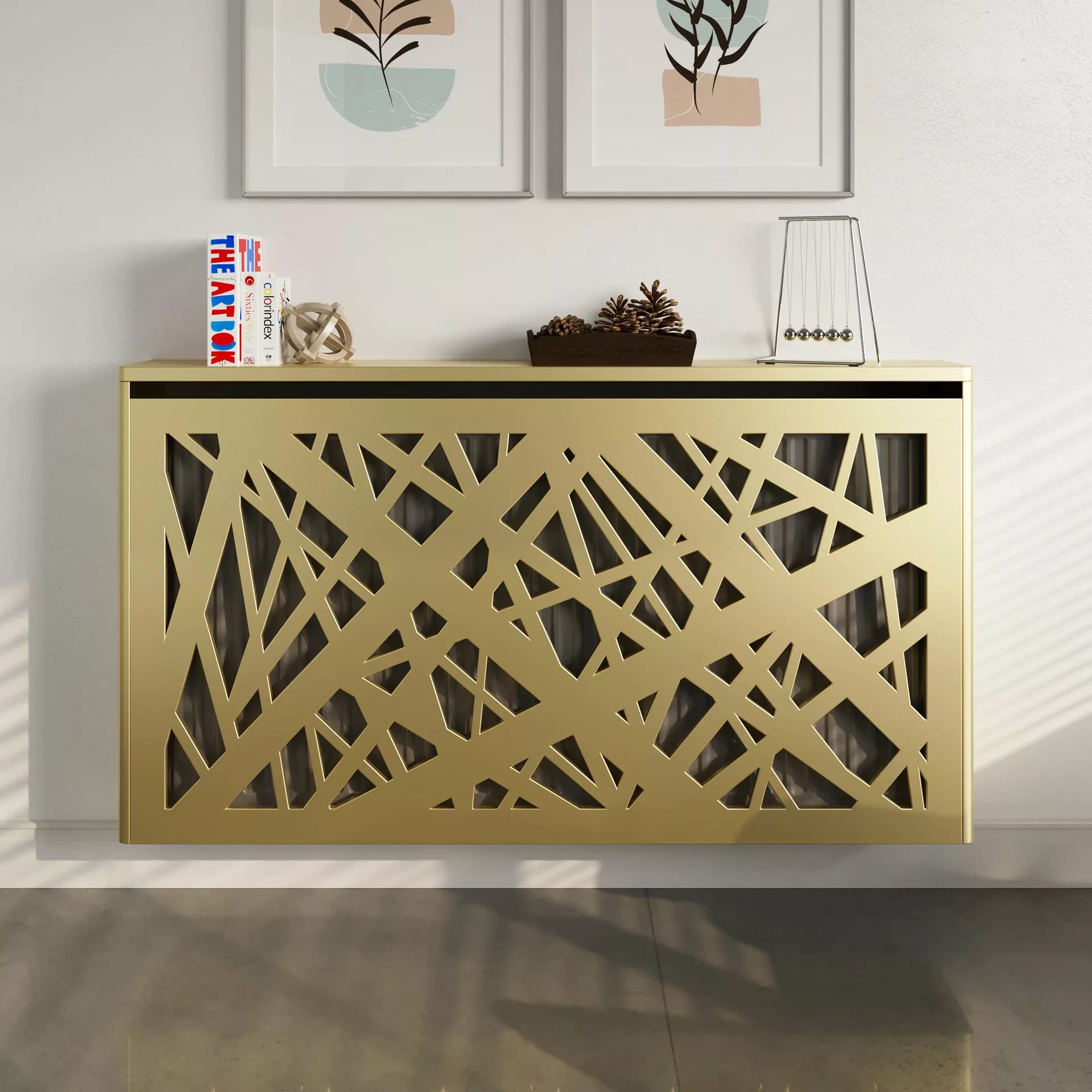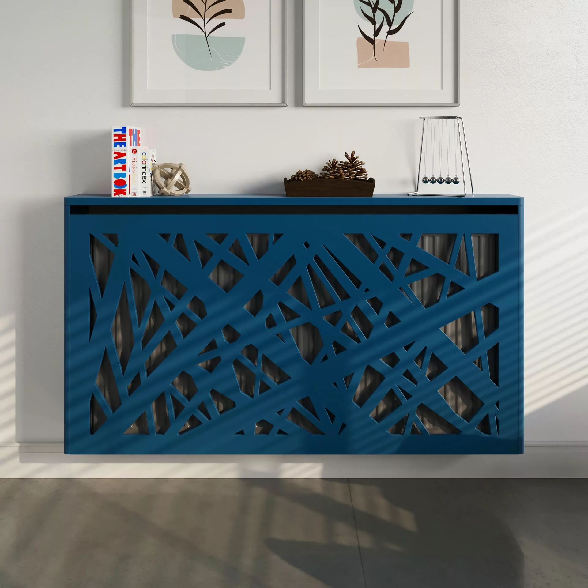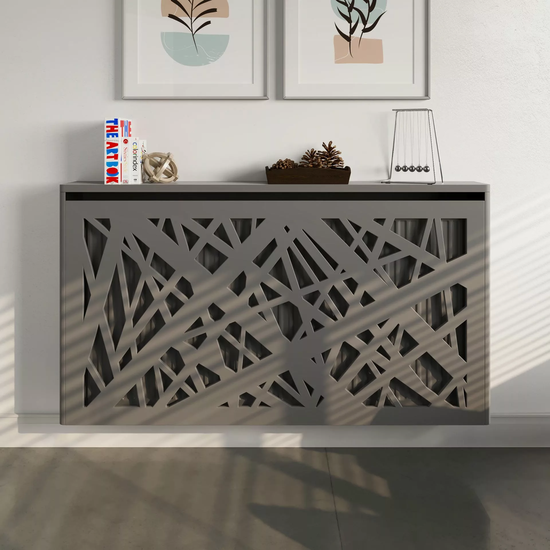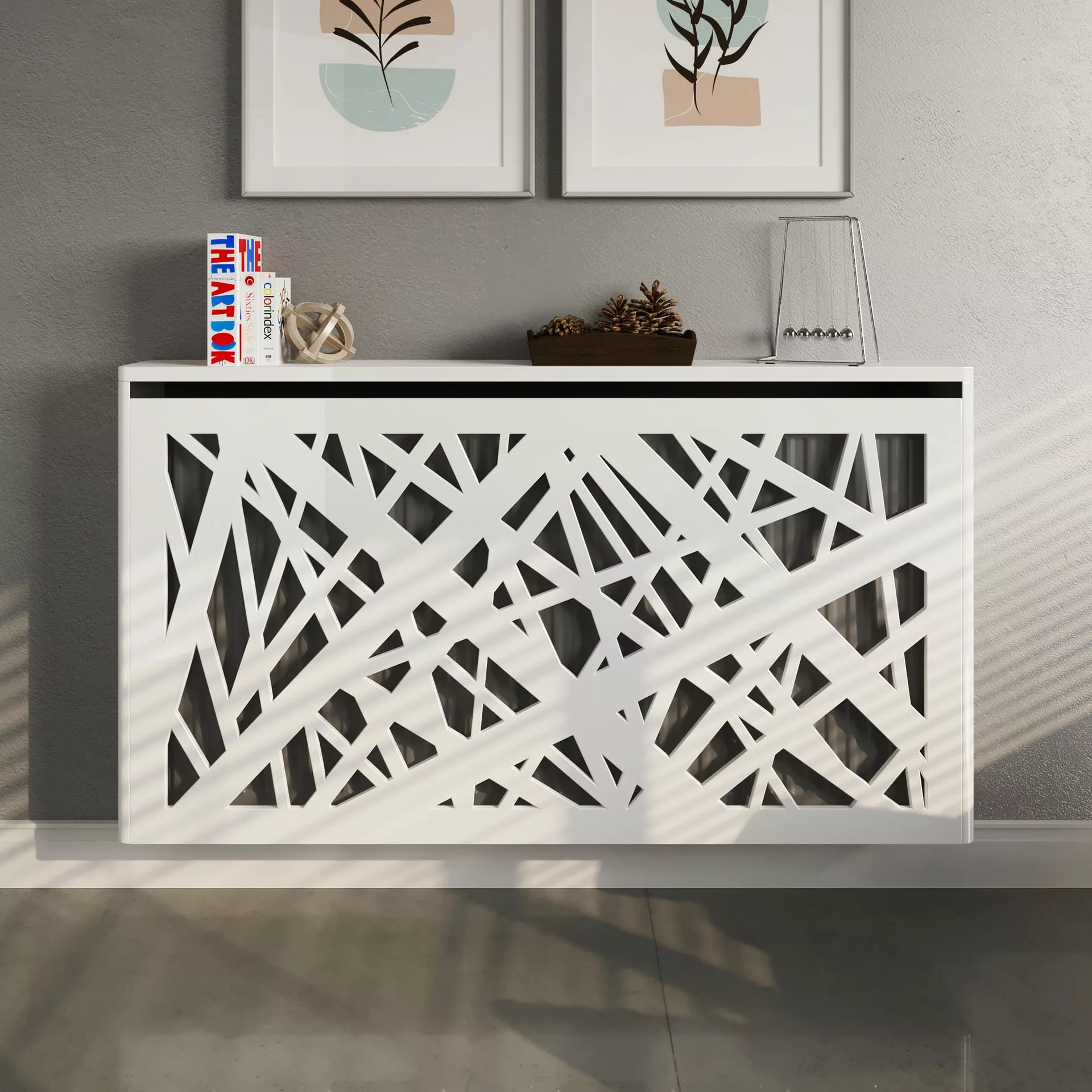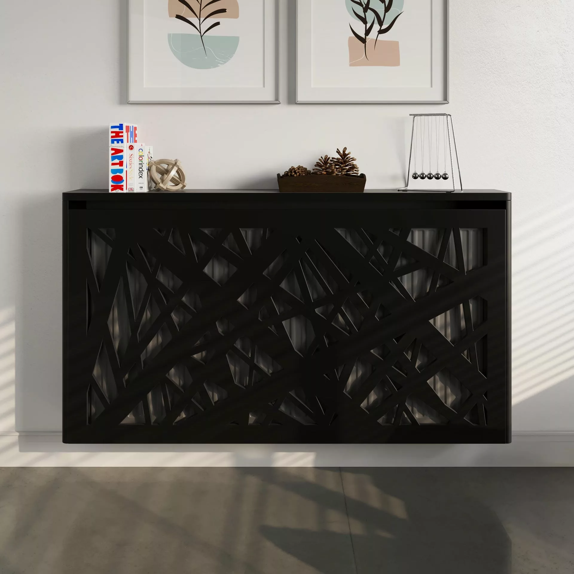 The chic, abstract design of this floating cabinet creates a contemporary focal point in your home while also concealing your radiator and providing shelving for homeware accessories.
